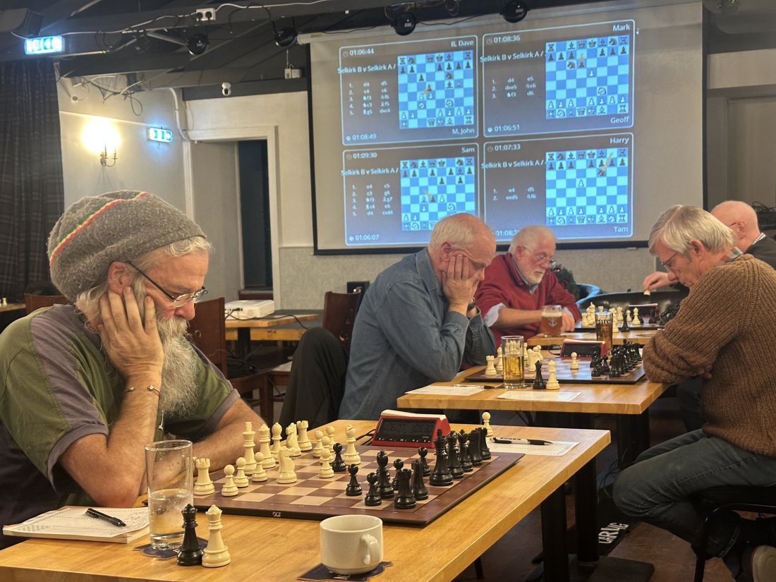 Next week - 16 December, to be exact - there will be an allegro tournament in the County Hotel. Teams of 4 will be drawn on the night from entrants and will play 10-minute matches against each other. It's not too serious, so do come along. Anyone wishing to play can just turn up for 7pm on the night - but it would be very helpful if you could inform Alan Armstrong in advance so that he might have a idea how many will be there.09 Dec 2025: Selkirk B 3½-½ Selkirk A