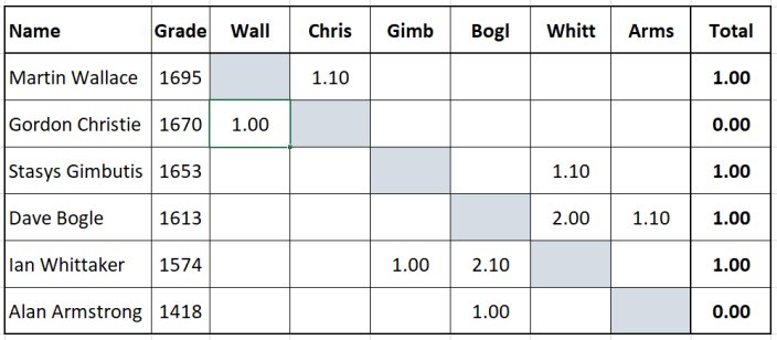The grades for 2022-23 are now out, with the usual mix of winners and losers. Logan Symons (NHS) has come up by 98 points to 1008 and - again in the NHS team - Stasys Gimbutis has put on another 97 points to be graded 1653 this season. In the Selkirk club, Dave Bogle is the greatest improver with a 70 point leap to 1613.But by a huge distance, the greatest jump is by Kelso's Ross Blackford; Ross has increased his grade by a spectacular 381 points to become the Borders number 1 on 1827. Yes, 1446 to 1827! Very impressive from 16-year-old Ross.