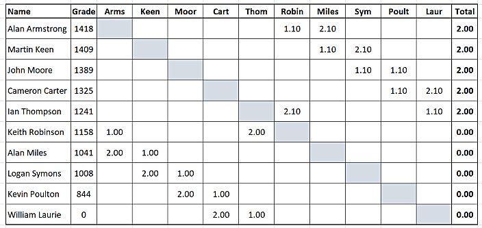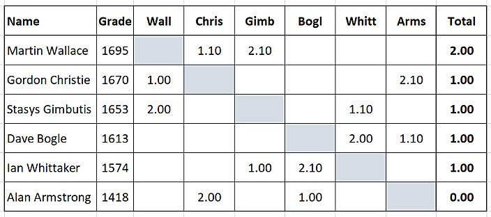 The grades for 2022-23 are now out, with the usual mix of winners and losers. Logan Symons (NHS) has come up by 98 points to 1008 and - again in the NHS team - Stasys Gimbutis has put on another 97 points to be graded 1653 this season. In the Selkirk club, Dave Bogle is the greatest improver with a 70 point leap to 1613.But by a huge distance, the greatest jump is by Kelso's Ross Blackford; Ross has increased his grade by a spectacular 381 points to become the Borders number 1 on 1827. Yes, 1446 to 1827! Very impressive from 16-year-old Ross.