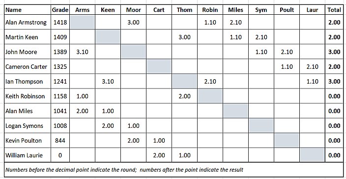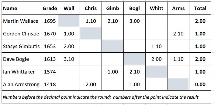 The Championship section of the Borders Individual Chess Championship is wide open, after Dave Bogle beat Martin Wallace on Tuesday. No-one in that section has 100%, and no less than 5 players are now in serious contention.In the Minor section, John Moore won against Alan Armstrong last week - and this week Ian Thompson beat Martin Keen, overturning a 168 Elo point deficit. This will also be a very close section. The current crosstables are below, and the Wallace-Bogle game is on the matches page...