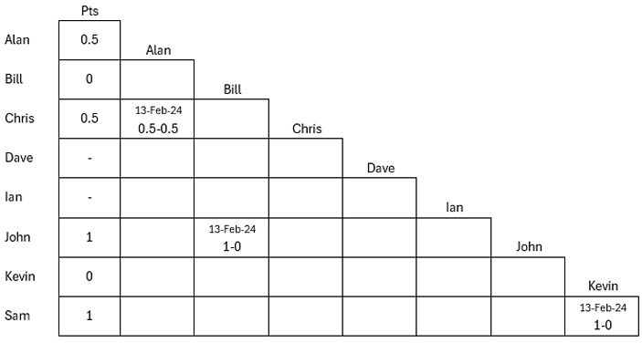 A result from the Championship section of the BICC. Martin Wallace has won his third round match, defeating Dave Bogle in a lively game. In the Selkirk Championship, three games were played on Tuesday evening: Sam Cornwell beat Kevin Poulton; John Moore beat Bill Miller; and Alan Miles and Chris Nathan drew their game.