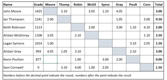 Tuesday 13th saw two games played in the Borders Individual Minor section: in a match in the Town Arms, Keith Robinson produced a snap mate against Sam Cornwell; and in the Focus Centre Ally Gray and John Moore played out a draw.