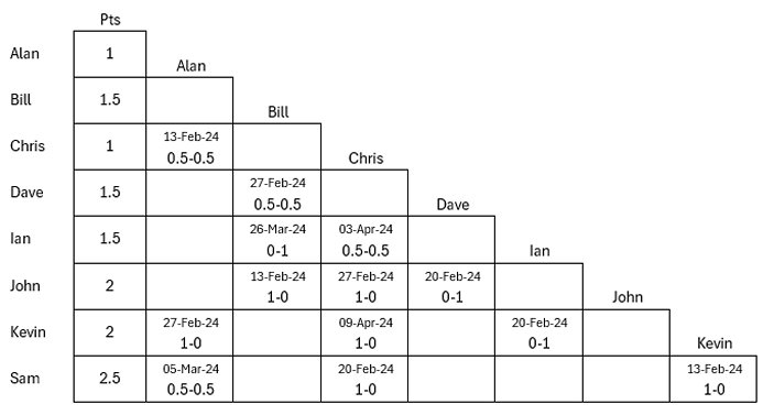Ther were three games played last night 16 April, all of which came out according to the grading: Dave Bogle beat Sam Cornwell; Bill Miller beat Chris Nathan; and Ian Thompson beat Alan Miles. The table below will be update soon to reflect these results.