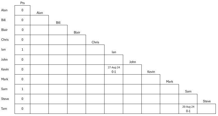 The first match saw Sam Cornwell (White) record a victory over new member Tam Wylie. In the second match, Kevin Poulton fought a hard game against the experienced Ian Thompson, but a blunder under pressure decided the game in Ian's favour.