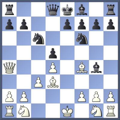 White in turn has a long think before castling, which is the best move. Qc7 adds a third attacker to the strong knight on e5 and connects the Black rooks. Stockfish marginally prefers Rc8 (with a threat to White’s d5 pawn. Black does of course want a rook on c8; however, as Black’s counterplay will be on the queenside (the direction in which the pawns are pointing), there is a case for moving the king’s rook to c8, and keeping the queen’s rook on the queenside.