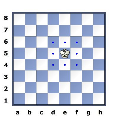 In this example, I have placed the White King on square e5, from where he could go to any one of the 8 squares next to him.