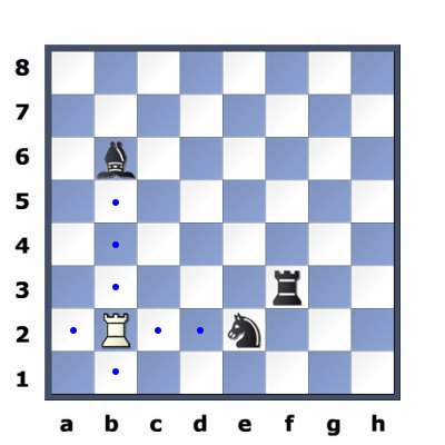 Alternatively, it has the option of capturing either the Bishop on b6 or the Knight on e2: the Rook would land on the square occupied by the Bishop, for example, and the Black Bishop would be taken off the board.