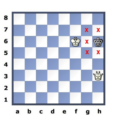 In this example, Black is not in check from the White Queen, but that same Queen is preventing him from moving anywhere. Draw by stalemate.