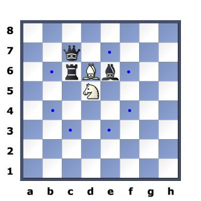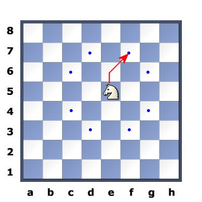 We have seen pieces which move in straight lines; but the Knight has a peculiar move which is "one straight and then one diagonally". Difficult to describe, and far better illustrated. Here it is.