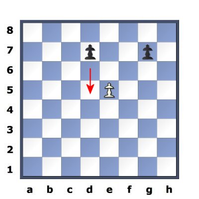 White has a pawn on his fifth rank (the horizontal rows 1-8 of a board are known as “ranks”) and Black has spotted that if he moves his d7 pawn one square to d6 it can be captured. Can the Black pawn evade capture by moving to d5? Nice try, but the answer is no.